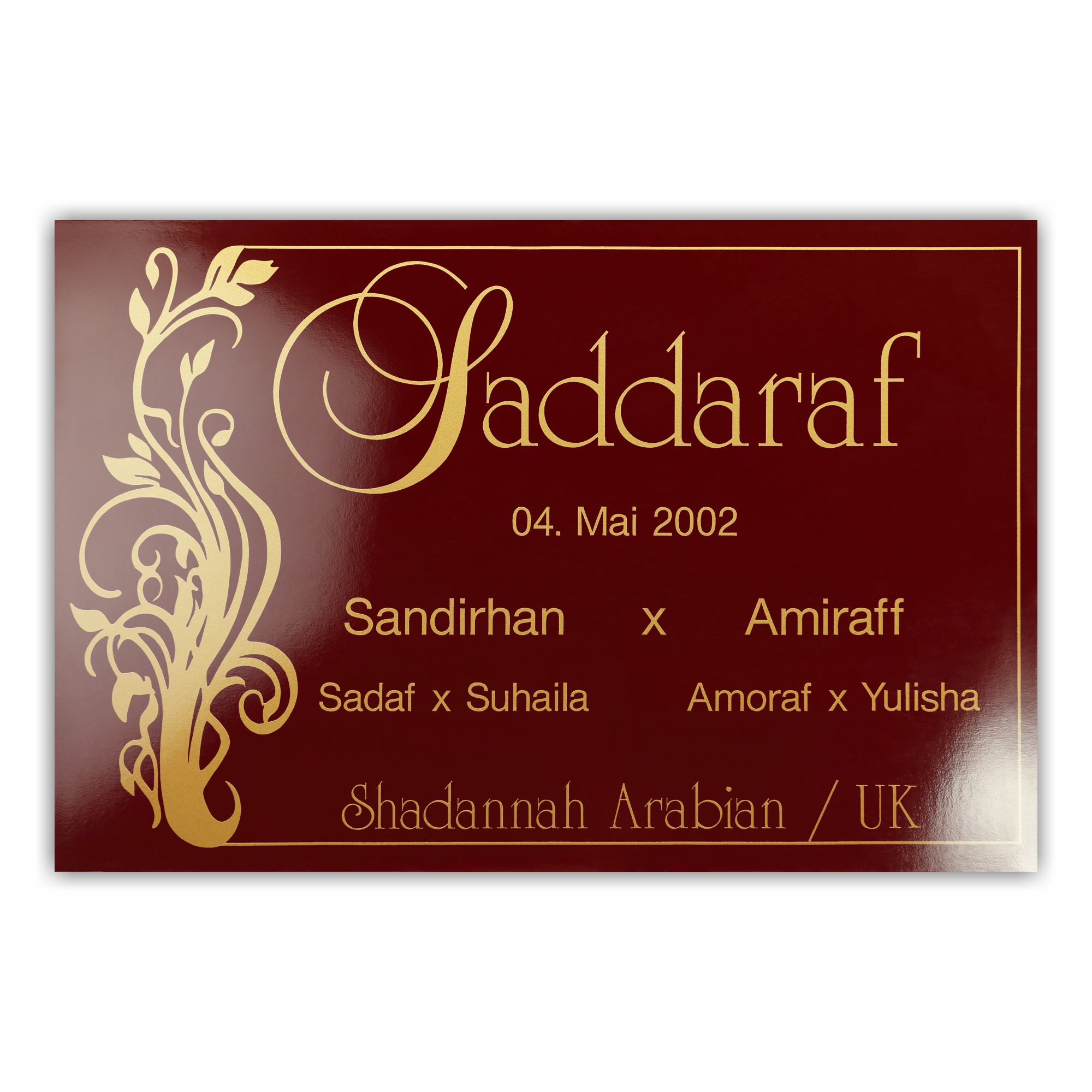 Important Notes: The ordering process requires i.a. the input of the data to be applied – name, date of birth, ancestry [parents & grandparents], footer [e.g. owner or stud name]. Text fields shown above are provided for this. Only the data for ONE pet can be entered per nameplate and design (colors)! If you change the data or colors, please add a new item to the shopping cart. Collective order: If you want to order more than one nameplate of the same design (colors) for different pets, please enter „separate list“ in the text field „name“. Then choose colors and quantity of plates, click on „add to cart“ and finish the order process. We will contact you separate to collect the data .