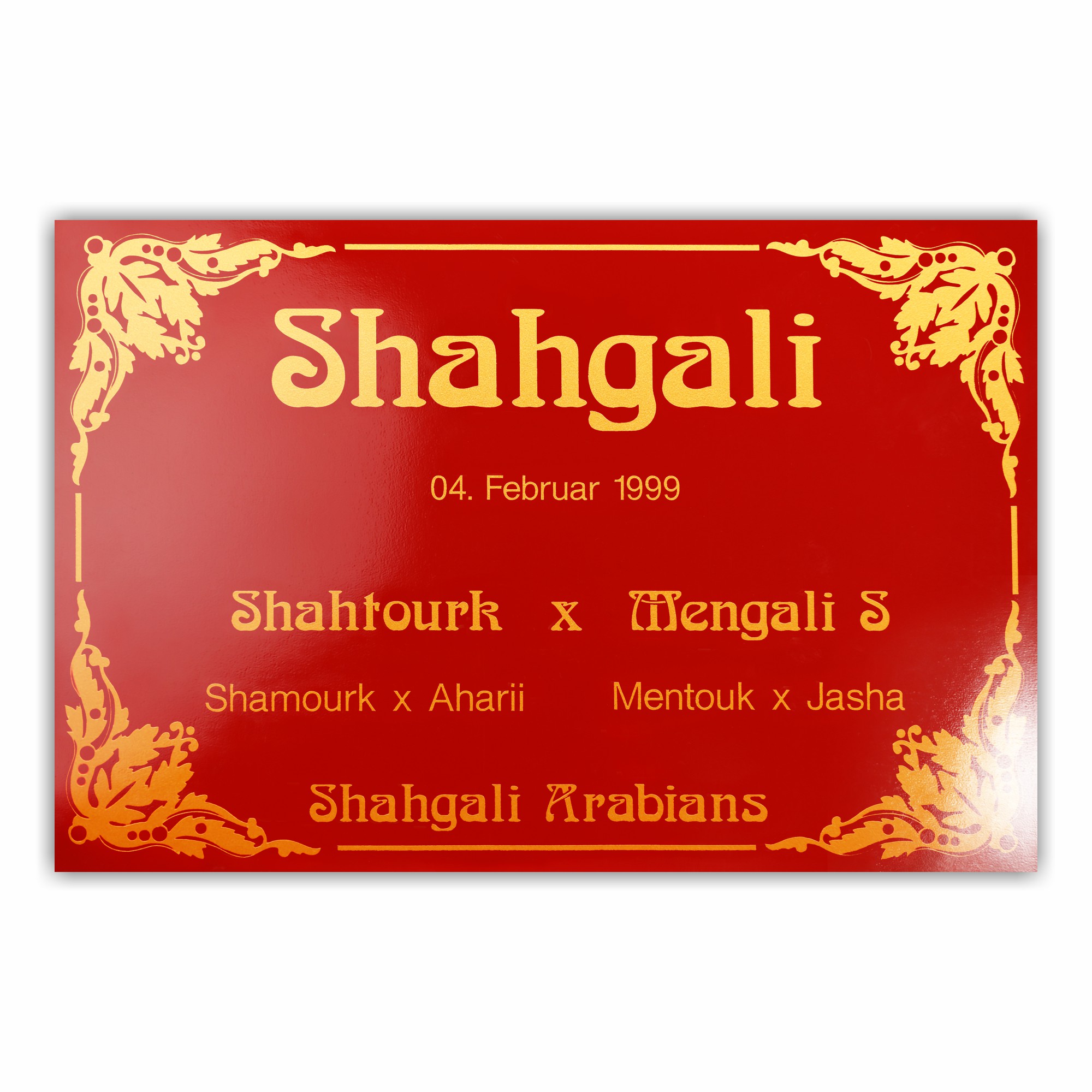 Important Notes: The ordering process requires i.a. the input of the data to be applied – name, date of birth, ancestry [parents & grandparents], footer [e.g. owner or stud name]. Text fields shown above are provided for this. Only the data for ONE pet can be entered per nameplate and design (colors)! If you change the data or colors, please add a new item to the shopping cart. Collective order: If you want to order more than one nameplate of the same design (colors) for different pets, please enter „separate list“ in the text field „name“. Then choose colors and quantity of plates, click on „add to cart“ and finish the order process. We will contact you separate to collect the data .